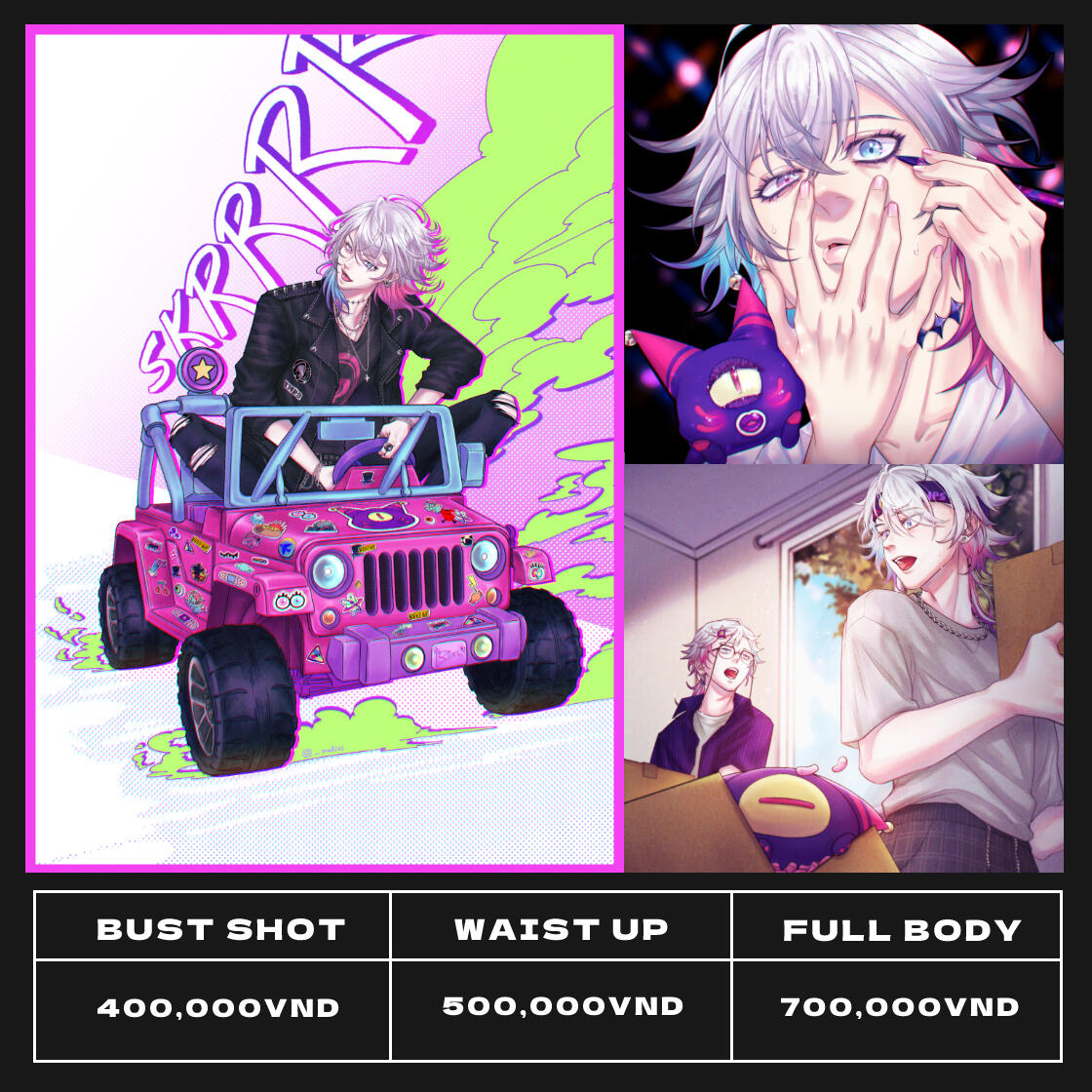 ✦ Nhân vật mang hình người, fanart, OC, nhân vật có tai, đuôi, cánh, răng nanh động vật, pet nhỏ OK✦ Sở trường của mình là vẽ concept hiện đại, thời trang streetwear, Y2K,...✗ Tả thực (fanart người thật nhìn không giống ảnh đâu nha), người già, trẻ sơ sinh, furry, quái vật, những chủ đề quá mức bạo lực✗ Mecha phức tạp (robots, xe cộ to,...), áo giáp⇒ Không khuyến khích các tạo hình, chủ đề fantasy cổ trang